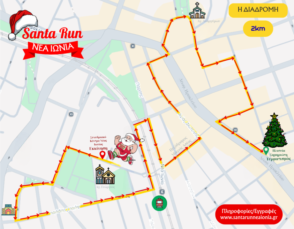 ΑΦΕΤΗΡΙΑ: ΚΕΠ Νέας Ιωνίας, Πατριάρχου Ιωακείμ, αριστερά Χρυσοστόμου Σμύρνης, δεξιά Αντλιοστασίου μέχρι το Δημαρχείο, αριστερά στην Αγίου Γεωργίου, αριστερά Διονυσίου Σολωμού, δεξιά Κάλβου, αριστερά στην Μικράς Ασίας και αριστερά στην Αγία Φωτεινής, δεξιά στην Κώστα Βάρναλη, απέναντι στην Λ. Ηρακλείου, αριστερά στην Ευαγγελικής Σχολής, δεξιά Ικαρίας, ευθεία στην Παλαιών Πατρών Γερμανού και αριστερά στο πεζοδρόμιο της Ελευθερίου Βενιζέλου έως την Αγνώστων Ηρώων, περνάμε απέναντι στην Ελευθερίου Βενιζέλου και επιστρέφουμε πηγαίνοντας αριστερά στην Μεσολογγίου έως την πλατεία Σημηριώτη που αποτελεί το ΣΗΜΕΙΟ ΤΕΡΜΑΤΙΣΜΟΥ και θα πραγματοποιηθεί το άναμμα του χριστουγεννιάτικου δένδρου.
